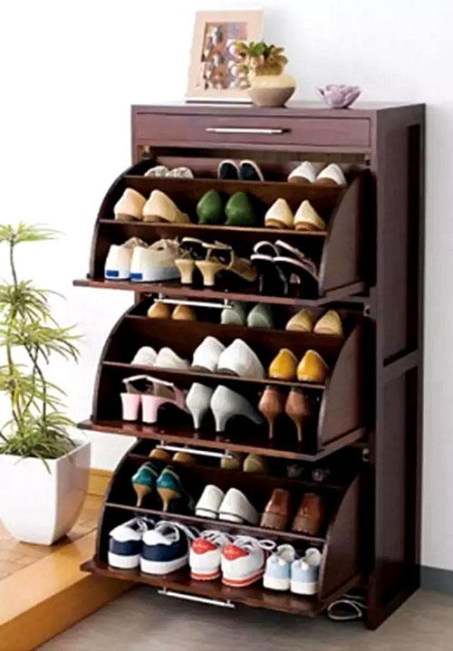 Открытые, как правило, считаются самыми распространенными в домах и квартирах. Изготовление и простота конструкции позволяет приобретение их в любую семью. Главное достоинство открытых тумб, это быстрое высыхание обуви за счет постоянного проветривания. С другой стороны, такой способ хранения станет постоянным пылесборником и будет требовать дополнительной уборки.