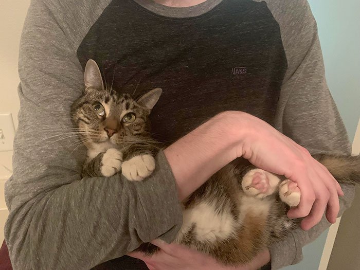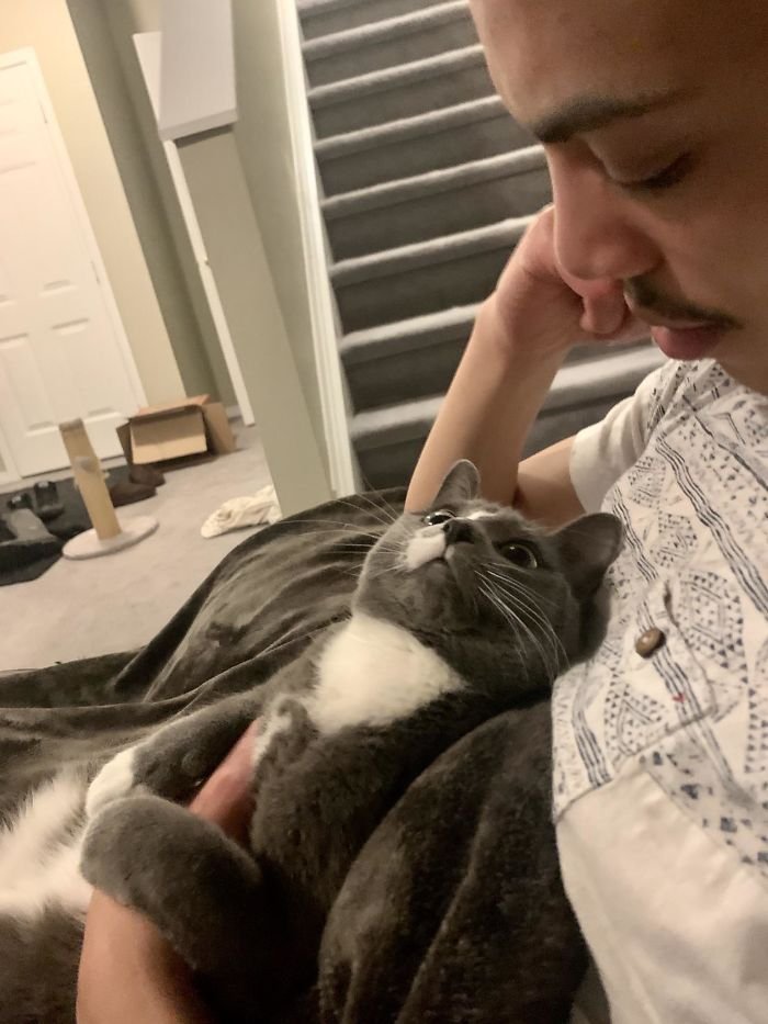 1. «Мой брат взял нашу кошку для фото. Только посмотрите как она смотрит на него»