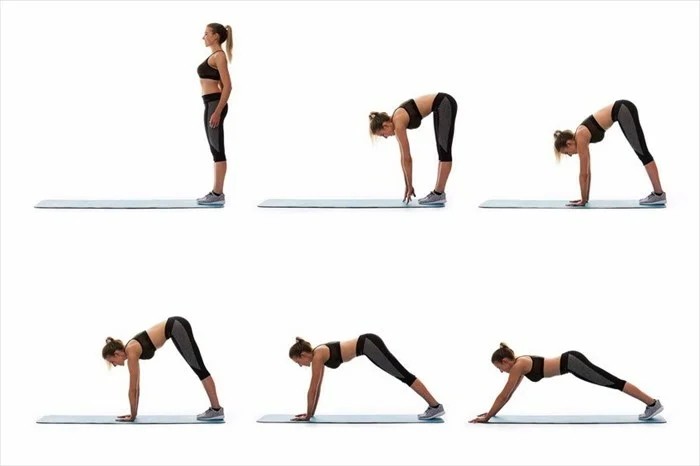 Стоим прямо, ноги на ширине плеч. Наклоняемся вниз и, не сгибая колен, касаемся ладонями пола и начинаем перебирать руками по полу вперед, пока не станем в упор лежа.
