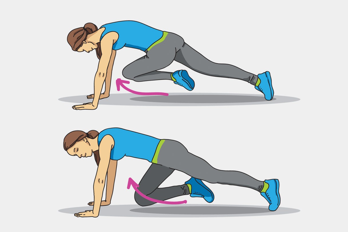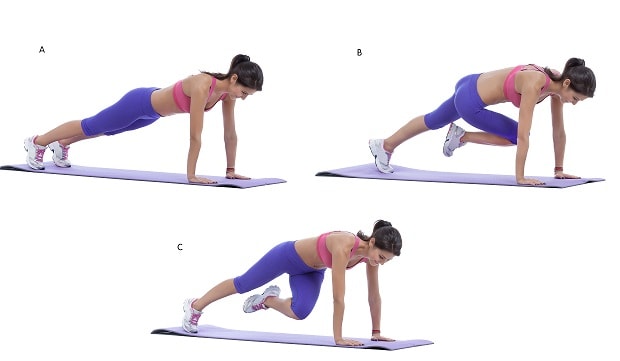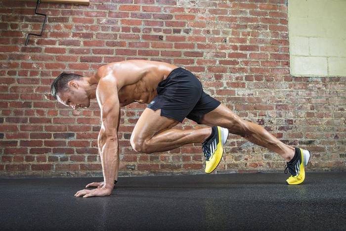 Принимаем упор лежа. Подгибаем левое колено вперед в сторону правого плеча, возвращаемся в исходное положение, подгибаем правое колено вперед в сторону левого плеча. Упражнение нужно выполнять быстро, без отдыха.
