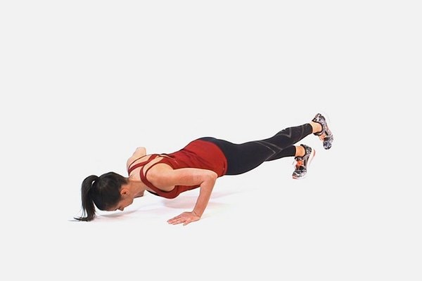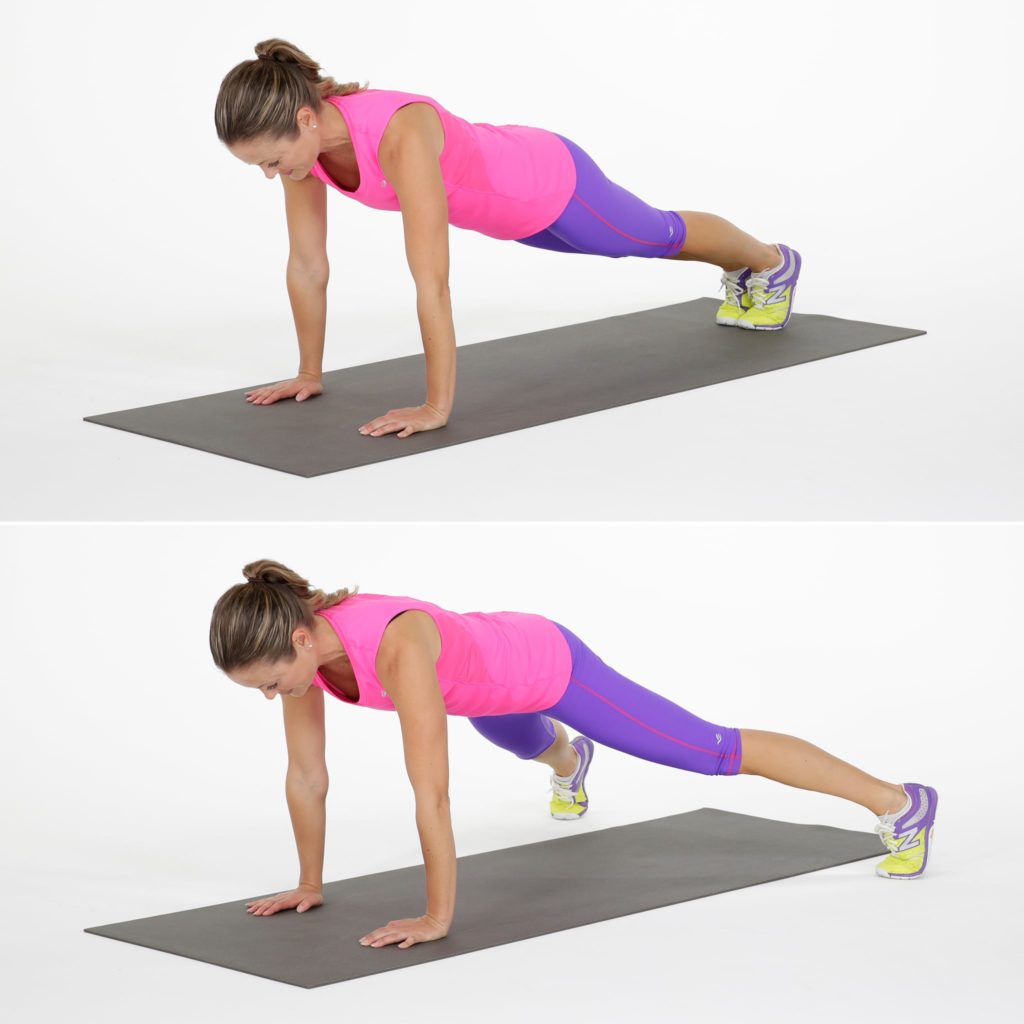 Принимаем упор лежа, руки на ширине плеч. Отжимаемся, касаясь предплечьями пола, не разводим локти в стороны. Возвращаемся в исходное положение. Заканчиваем упражнение поочередными подгибами правого и левого колен к груди.