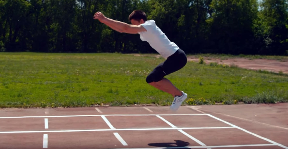 Стоим прямо, ноги на ширине плеч, колени немного согнуты. Раскачиваемся, отводя руки назад и немного приседая, что прыгнуть вперед как можно дальше.