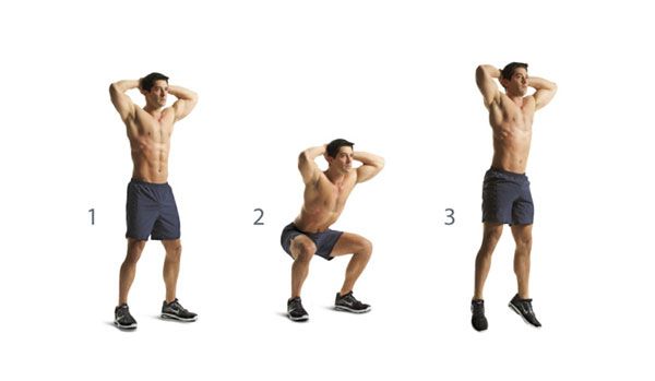 Стоим прямо, ноги на ширине плеч. Делаем глубокий присед, спина при этом прямая. Из этого положения прыгаем вверх как можно сильнее. Полностью выпрямляем ноги в прыжке и толкаем руки в воздухе вниз, чтобы придать импульс движению.