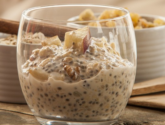 - Смешайте все ингредиенты, кроме семян чиа, в блендере до получения однородной массы. Добавьте семена чиа и перемешайте. Перелейте в большую миску и уберите на ночь в холодильник.
