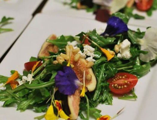- Выложите на тарелку рукколу и помидоры, залейте соусом и перемешайте. Посыпьте орехами и сыром. Выложите сверху ломтики инжира.