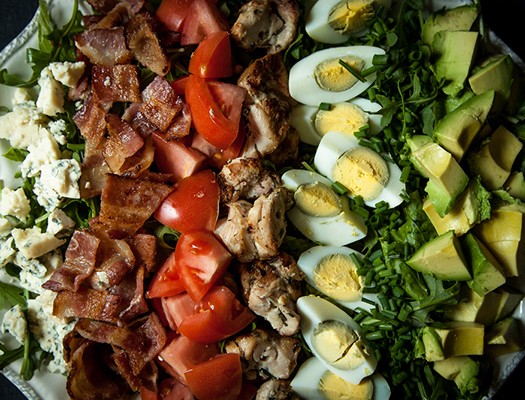 - Выложите ромэн на край тарелки, рядом такими же рядами все остальные ингредиенты. Полейте оставшимся соусом.