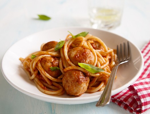 - На дно кастрюли влейте немного томатного соуса, выложите фрикадельки, а сверху — оставшийся соус. Готовьте на медленном или среднем огне в течение приблизительно 45 минут или пока фрикадельки не будутполностью готовы.