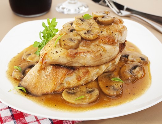 - Оботрите одну сковороду бумажным полотенцем и вновь сбрызните маслом, выложите и готовьте 3 минуты. Добавьте чеснок и готовьте еще 1 минуту. Перемешайте и добавьте оставшиеся 1,5 ст.л. муки. Влейте вино и куриный бульон, доведите до кипения и варите пока соус не загустеет, около 3 минут. Снимите кастрюлю с огня. Вмешайте йогурт, приаправьте солью и перцем. Выложите грибную смесь на курицу и подавайте к столу.