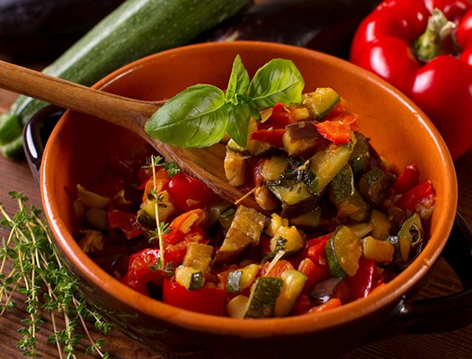 - Пассируйте лук и чеснок в масле в глубокой кастрюле с тяжелым дном. Когда лук станет полупрозрачными, добавьте перец, баклажаны, кабачки ихорошо перемешайте. Уменьшите огонь, накройте кастрюлю плотно крышкой и готовьте на медленном огне в течение 10 минут, встряхивая кастрюлю два или три раза для равномерной готовки.