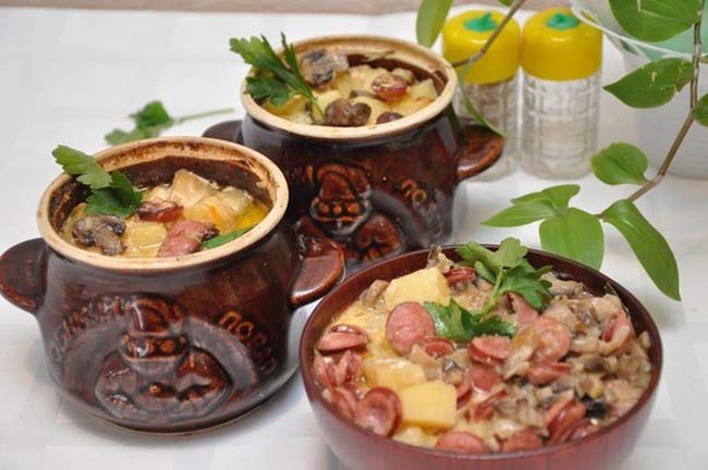 - 6. Картошка с сосисками в горшочках