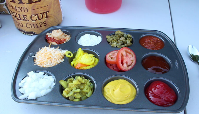 В форме для маффинов можно разместить соусы, приправу или горчицу. Этот способ избавит вас от мытья большого количества посуды