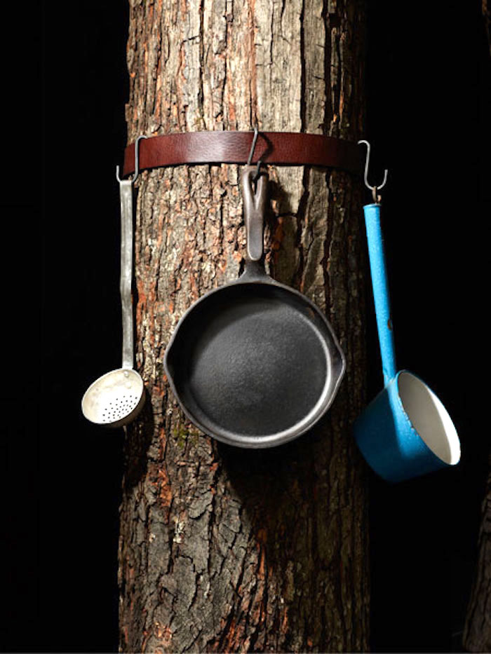 Используя кожаный ремень и крючки из проволоки, получится довольная удобная вешалка для посуды или одежды