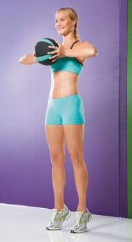 Возьмите медицинский мяч и, удерживая его перед грудью (локти направлены в стороны), встаньте ноги на ширине таза, а затем приподнимитесь на мыски. Присядьте, вытягивая руки перед собой, локти до конца не выпрямляйте. Вернитесь в исходное положение, поднявшись на мыски, и повторите.
