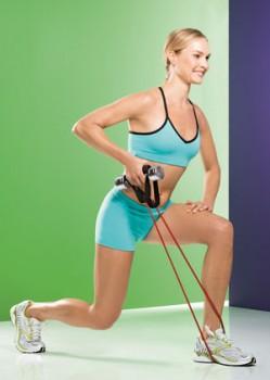 Левой ногой встаньте на середину эксертьюба, согните ее в колене, а правой сделайте шаг назад. Возьмите в правую руку гантель и ручки эксертьюба, левую положите на левое бедро и наклонитесь вперед. Подтягивая гантель к правому боку, одновременно опустите правое колено ниже и сделайте более глубокий выпад. Вернитесь в исходное положение и повторите. Выполните упражнение в другую сторону.