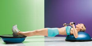 Медицинский мяч весом 4–6 кг, пара гантелей весом 2,5–4 кг, эксертьюб с ручками, бодибар весом 4,5–7,5 кг, 2 платформы босу (или 2 скамьи) и фитбол.