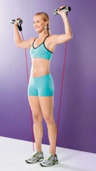Встаньте на середину эксертьюба, ноги на ширине таза. Возьмите в каждую руку гантель и ручку эксертьюба и поднимите до уровня плеч, локти согните под прямым углом. Вытяните левую руку вверх. Опустите и, завершая повтор, вытяните правую.