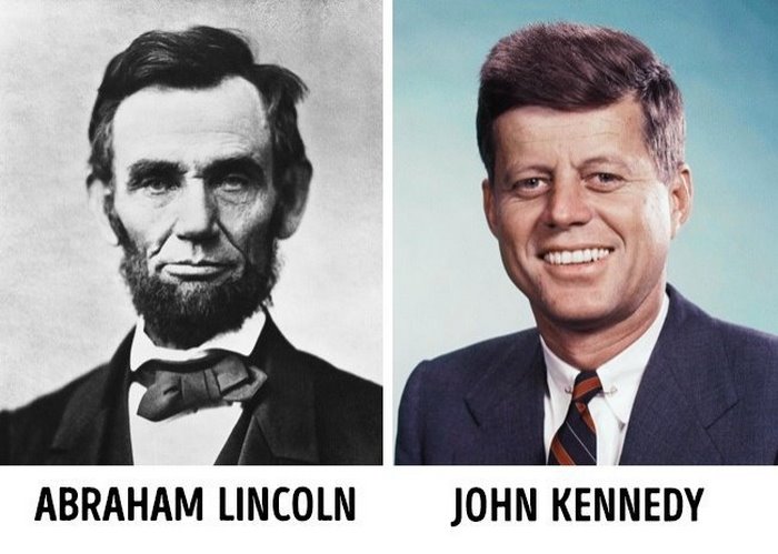 Авраам Линкольн и Джон Кеннеди были избраны в Конгресс с интервалом ровно 100 лет. Они оба погибли от огнестрельных ранений в затылок, оба — в пятницу перед праздником (Кеннеди был убит накануне Дня благодарения, а Линкольн — перед Пасхой), и обоих в день убийства сопровождали их жёны и другая супружеская пара.