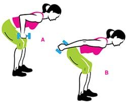 - Возьми две гантели по 2 кг, поставь ноги на ширину бедер, слегка согни колени и, отводя таз назад, наклони корпус. Сохраняя небольшой прогиб в пояснице и приводя лопатки к позвоночнику, подними снаряды к низу живота (последний держи подтянутым) (A).