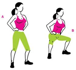 - Встань прямо, поместив ступни шире таза: носки немного разведены в стороны, руки на поясе (A).