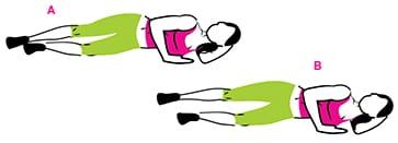 - Приляг на бок: одна рука под головой, вторая удобно упирается в пол на уровне груди; нижняя нога согнута в колене, вторая – прямая, носок тянется вперед и касается пола, бедро – «жесткое», кор – подтянут (A).
