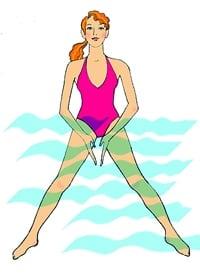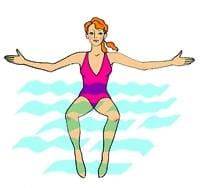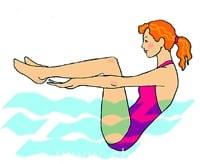 Вариант для тех, кто не умеет плавать. Подтяните колени к груди, выталкиваясь из воды ладонями. Пресс напряжен, спина прямая. Не напрягайте стопы, пальцы ног держите на воде.