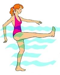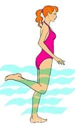 Исходное положение. Тело в вертикальном положении. Поочередно сгибайте в коленном суставе правую и левую ноги. Спина прямая, таз впереди, ягодицы напряжены. Затем сведите колени вместе (смотрят на дно). Старайтесь достать пяткой до ягодицы. Дыхание произвольное.