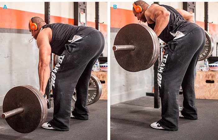 Тяга в наклоне нацелена, главным образом, на верхнюю часть тела, но это не значит, что положение коленей не влияет на результат. Если вы присядете слишком глубоко, тазобедренные суставы окажутся слишком низко. Фиксировать корпус при движении штанги станет намного сложнее.