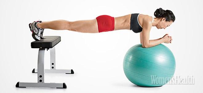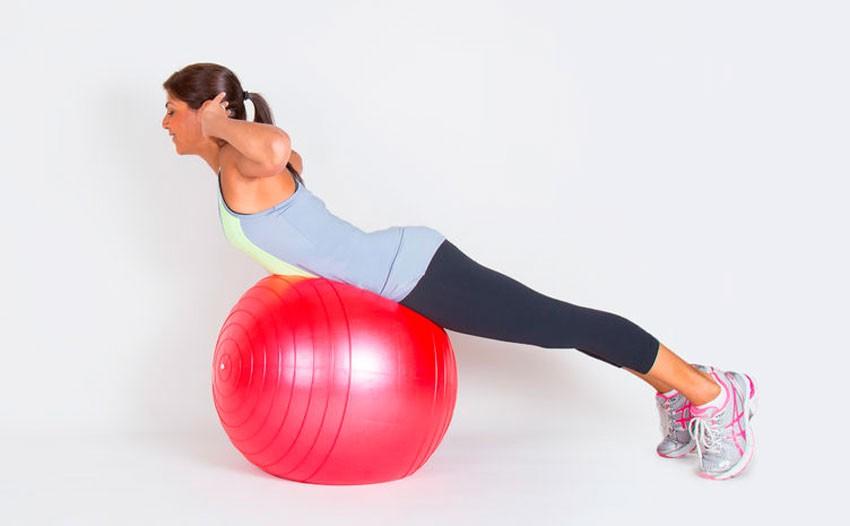 - Располагаемся возле скамьи. Опереться на фитбол предплечьем, локти должны находится на одной линии под плечами.