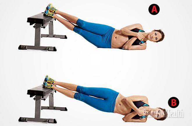 - Ляг на левый бок перпендикулярно скамье для упражнений. Обе ноги положи на край скамьи, следи, чтобы правая нога лежала поверх левой. Руки должны быть скрещены перед собой на груди (А).