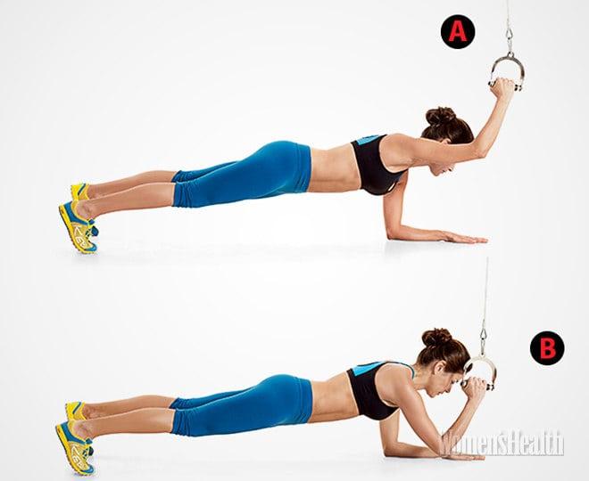 - Обопрись на колени и руки, локти лежат ровно на ширине плеч. Взявшись за рукоятку тяги правой рукой, встань в положение планки.