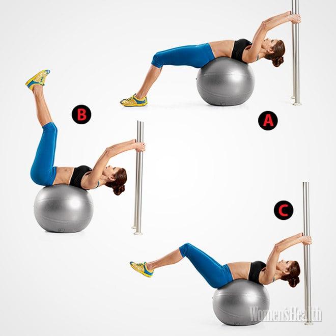 - 1. Упражнение лежа на фитболе, ноги на скамье