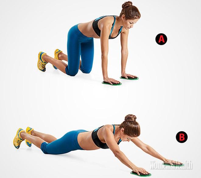 - Встань в упор на руки и колени, проследи за тем, чтобы последние были ровно под тазом, а руки на ширине плеч. Под каждую ладонь подложи скользящий фитнес-диск (А).