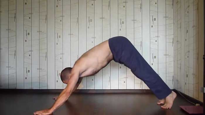Лягте на пол лицом вниз, затем следует поднять таз и выгнуть спину дугой. При этом таз находится выше уровня опущенной головы. Тело должно иметь опору исключительно на пальцы ног и ладони. Ноги на ширине плеч. Колени и локти выпрямлены, создавая позвоночнику необходимую напряженность. Опустив таз почти до пола, поднять голову, затем резко откинуть ее назад. Упражнение следует делать не спеша. Опустив таз, максимально низко, затем не спеша поднять его как можно выше, при этом следует выгнуть спину и снова повторить. При правильном выполнении упражнения чувствуется некоторое облегчение, за счет расслабления позвоночника.