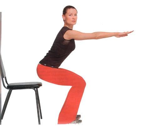 Поставьте ноги на ширину плеч,стопы параллельно друг другу. Перенесите центр тяжести на пятки и приседайте так, будто хотите сесть на стул — до момента, пока бедра не окажутся параллельно полу. Задержитесь в этом положении 1—2 секунды. Вернитесь в исходное положение. Выполните 15 таких приседаний.