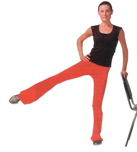 Встаньте, придерживаясь одной рукой за спинку стула. Немного согните в колене правую ногу — она будет опорной. Поднимайте левую ногу в сторону, задержите ее в верхней точке на 1—2 секунды, потом верните в исходное положение. При подъеме ноги старайтесь разворачивать стопу пяткой в потолок, иначе нагрузка «уйдет» на переднюю поверхность бедра. Повторите упражнение 20—25 раз. Не забудьте проделать то же самое правой ногой.