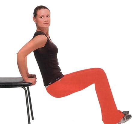 Сядьте на стул, опираясь руками на его край. Проследите, чтобы ладони были на ширине плеч. Согнутые в коленях ноги поставьте на пятки. Сгибая руки в локтях и свесив ягодицы, медленно опускайтесь вниз, при этом старайтесь направлять локти четко назад. Затем, выпрямляя руки, вернитесь в исходное положение. Повторите упражнение 8—12 раз