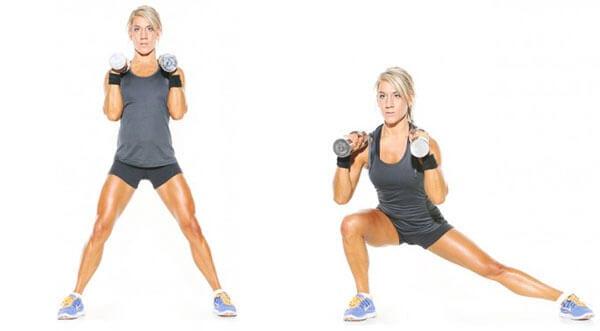 - с гантелями — делать приседания и выпады;