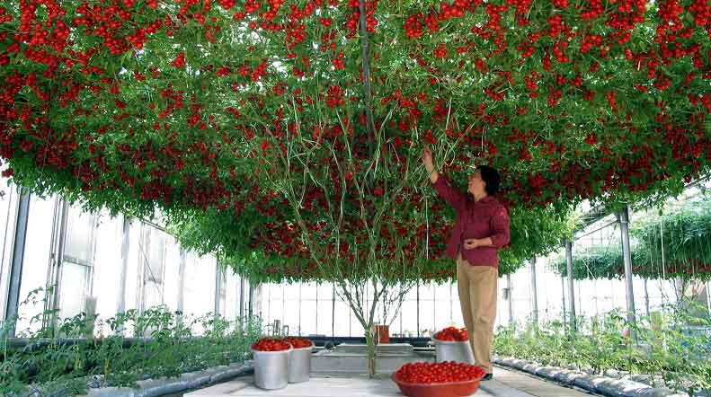 Его рост может составлять четыре метра и даже большую высоту, а площадь кроны около сорока-пятидесяти кв.м. Урожайность в течение года таких томатов составляет фантастическую цифру – около четырнадцати тысяч помидор, суммарная масса которых достигает полторы тонны.