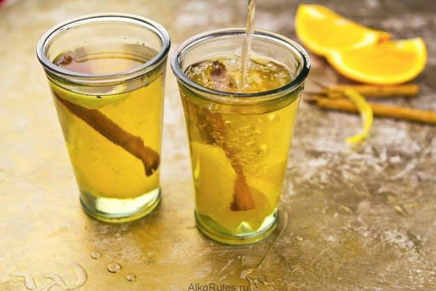 Ингредиенты смешайте и поставьте на огонь для нагревания. Главное условие – не доводить до кипения. После дайте настояться и обязательно процедите. Украсьте кружочками лимона.
