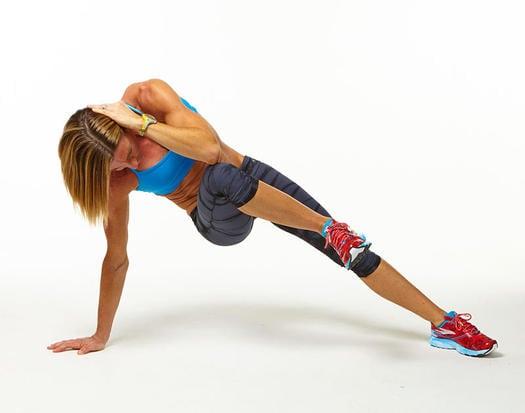 - Подтяните правое колено к правому локтю через сторону, задержитесь на пару секунд, затем вернитесь в исходное положение.
