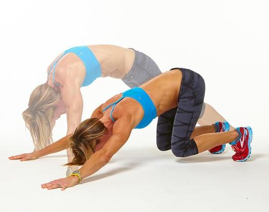 - Согните колени и выпрямите руки, подняв таз и вытянув спину.