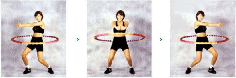 - Меняем скорость и перемещаем хулахуп. Начните вращение на уровне коленей, наращивая скорость движения, поднимите круг на бедра, затем на талию.