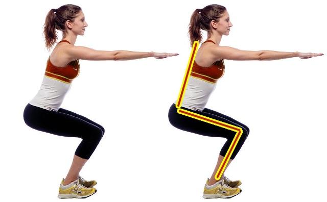 Техника выполнения упражнения проста – станьте ровно, ноги врозь на расстоянии 40-50 см, руки сложены в замок перед собой или удерживают гантели. Приседать надо плавно, отводя таз назад, спина в это время остается прямой. Когда бедра станут параллельны поверхности пола, возвращаемся в ИП. Чем ниже присед, тем больше в работу вовлечены ягодицы. Существует много вариаций упражнения (сумо, с узкой постановкой ног, с прыжком, «пистолет»), которые можно практиковать после освоения классической техники. Без приседаний, качая попу, не обойтись.