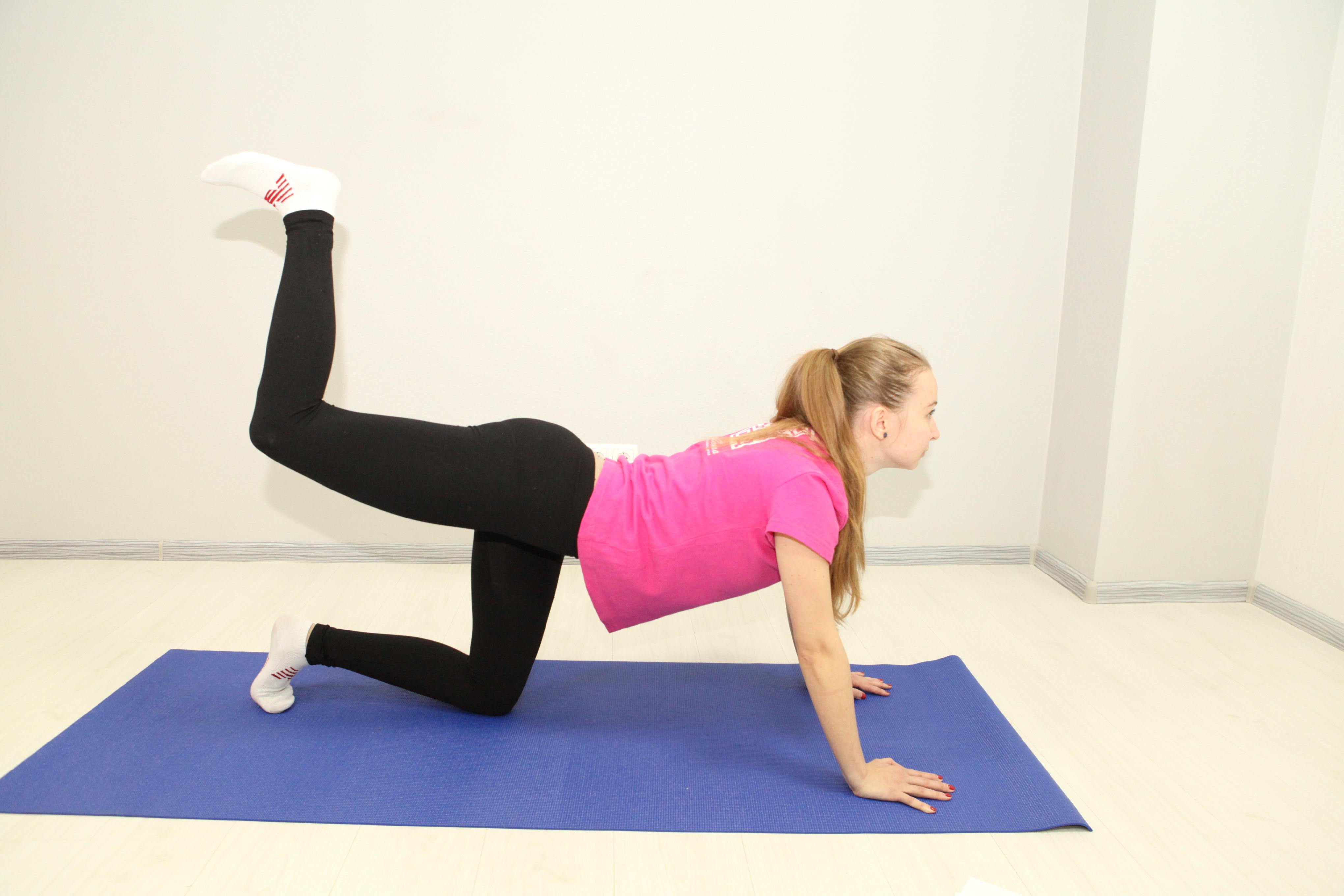 - Подъем бедер. Станьте на четвереньки, руками сделайте упор на предплечья. Отводите одну ногу назад и вверх до положения, когда бедро будет параллельно полу. Затем вернитесь обратно. Выполнять упражнение надо по 30 секунд на каждую ногу.