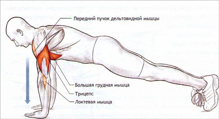 Нагрузку получают трицепсы, дельтовидные мышцы, бицепсы, пресс и грудные мышцы. Хорошая прокачка последних особенно актуальна для девушек – это хороший способ визуально увеличить грудь. Вот так выглядит схема работы мышц при классических отжиманиях: