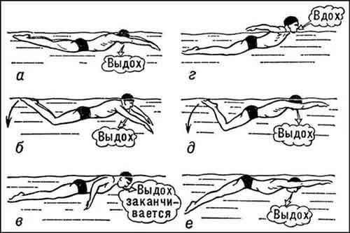 Вдох делается при совершении гребка, когда туловище слегка поворачивается в сторону. Важным правилом является непрерывное дыхание. Вы делаете вдох, затем, когда голова вновь опускается в воду, постепенно выдыхаете. Более наглядно технику кроля проиллюстрирует фото.