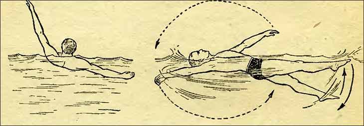 Раз уж я решил расположить стили по их скорости, то третьим будет плавание на спине. Единственный стиль при котором вы лежите на воде спиной, а не грудью. К тому же ваше лицо постоянно находится на поверхности, что позволяет свободно дышать. С технической точки зрения плавание на спине освоить не сложно. Руки делаю попеременные гребки. При этом ладони должны проходить ниже уровня спины, чуть в стороне от туловища. Ноги работают как в кроле.