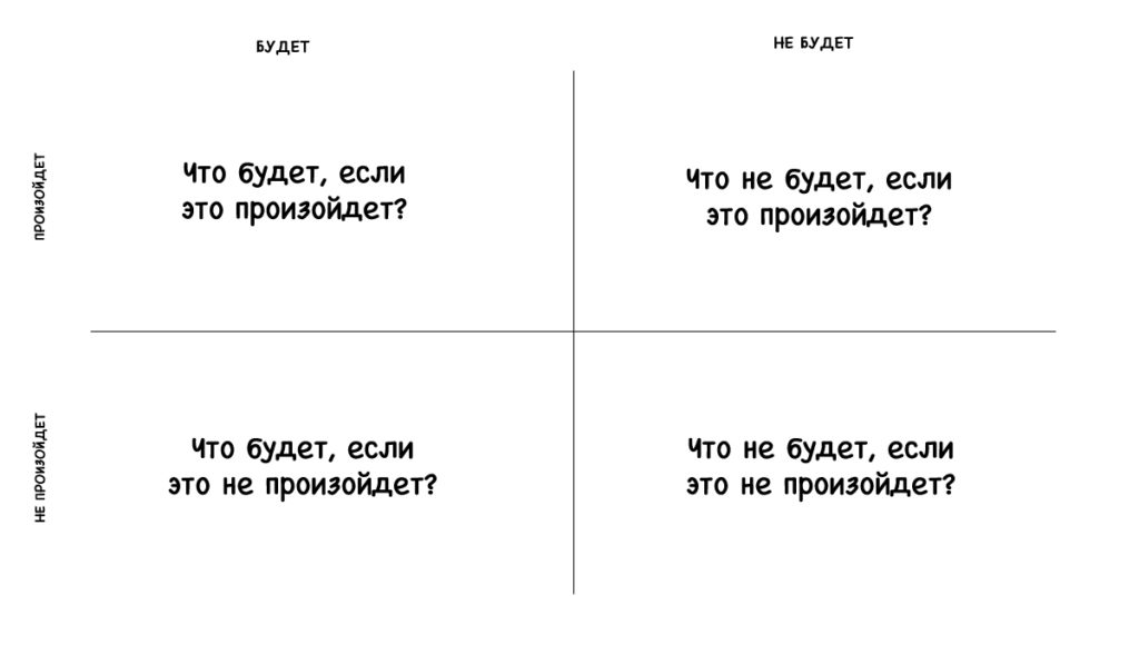 Возьмите листок и разделите его на четыре части, сделав небольшую таблицу. Столбики будут отвечать за «будет/не будет», а строки за «произойдет/не произойдет». В итоги получится четыре ячейки с разными вопросами:
