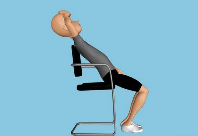 Сядьте на стул с короткой спинкой. Двигайте ваш таз к краю сиденья, пока спинка стула не коснется той части позвоночника, которую вы будете массажировать. Положите ладони на лоб и медленно выдохните. Ваши голова и плечи начнут опускаться за стул и вы должны почувствовать несколько мощных щелчков.