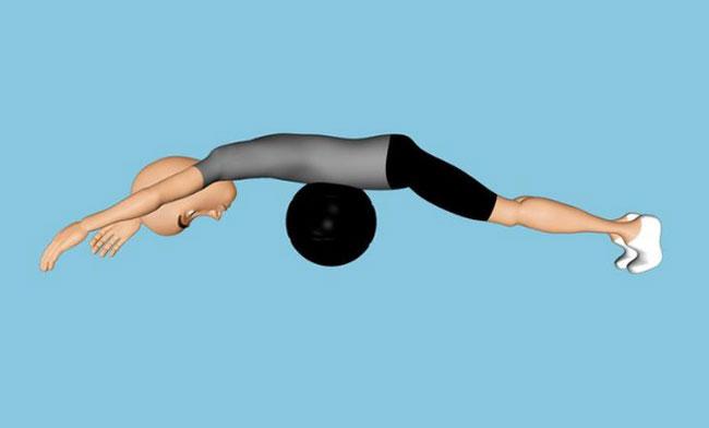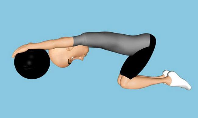 Декомпрессия нижней части позвоночника. Лягте грудью и животом на мяч для упражнений. Медленно накатитесь на него так, чтобы ваши пальцы касались пола, а колени находились в воздухе. Позвольте вашим рукам свободно обвиснуть и расслабьте мышцы спины.